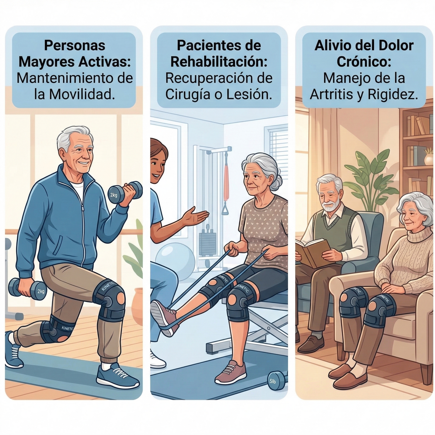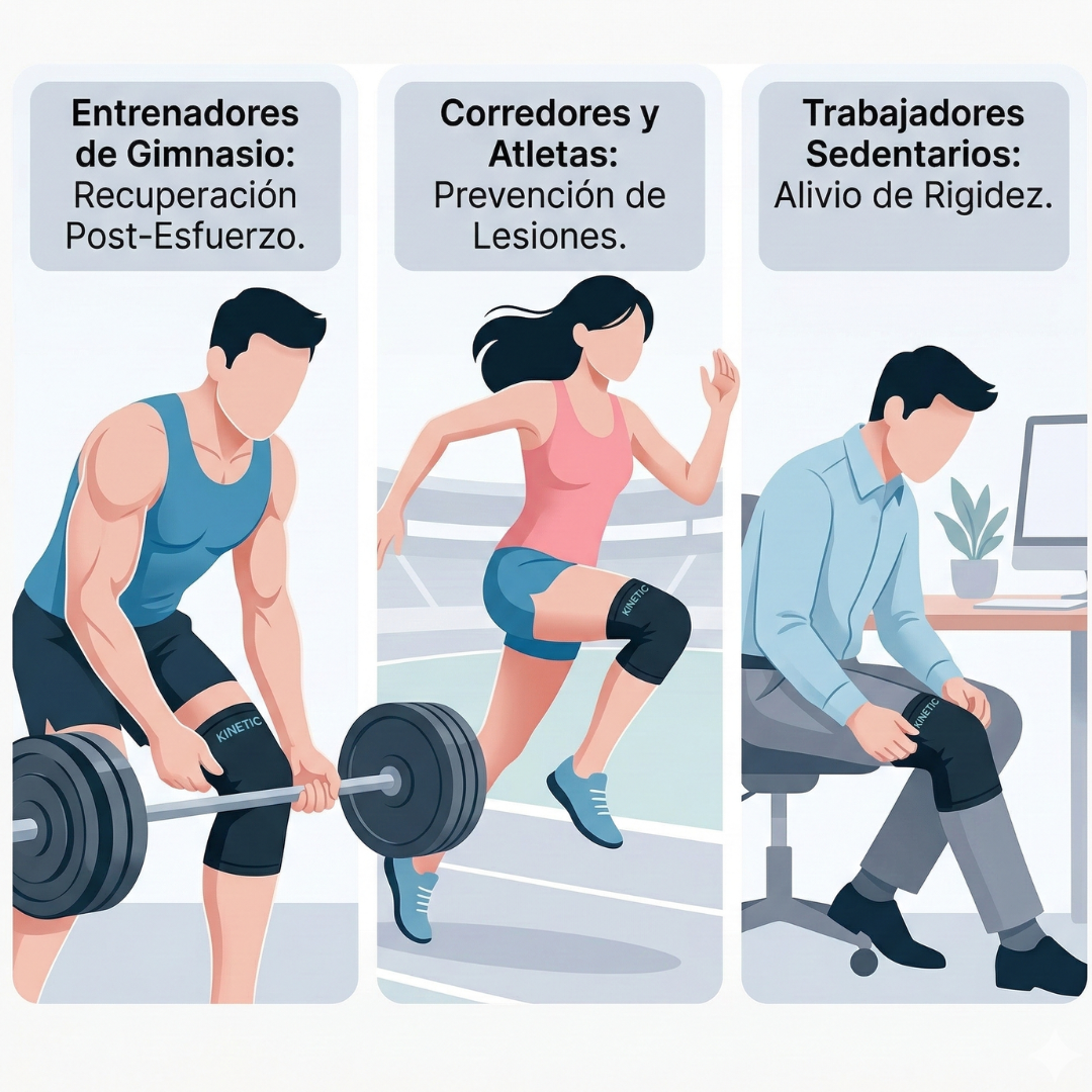 - Solución con CALOR: El calor profundo de Kinetic relaja la musculatura que rodea la rodilla. Al aliviar la tensión muscular, disminuye la presión sobre la articulación desgastada, permitiendo un rango de movimiento mucho más cómodo y sin dolor.